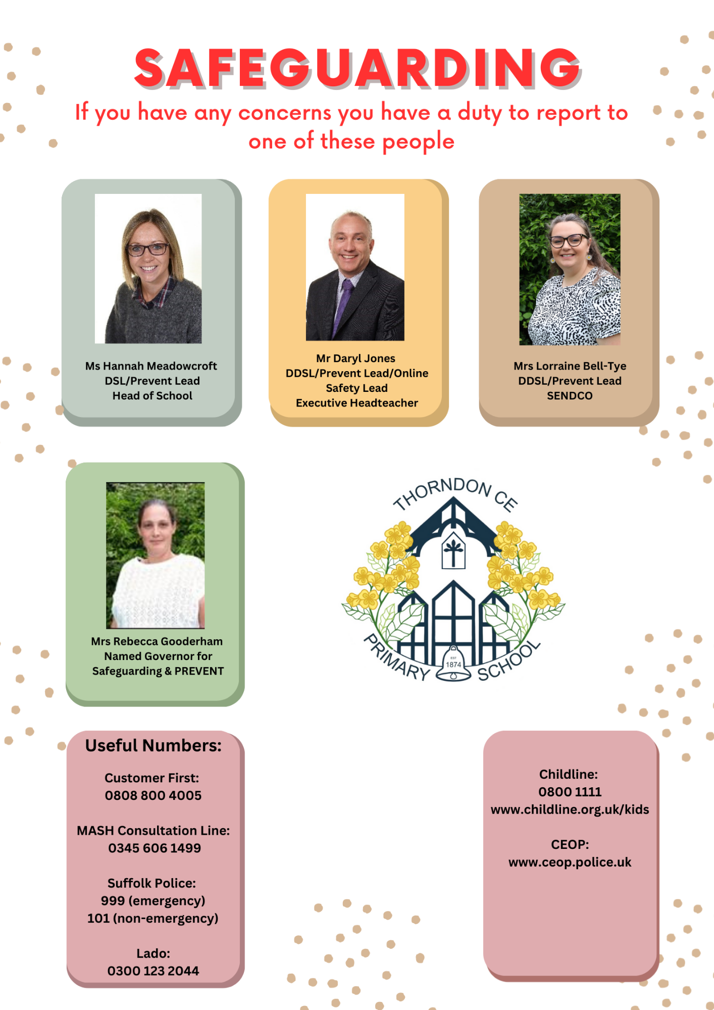 If your concern arises outside of term-time or outside of school hours, please contact Hannah Meadowcroft via email, which will be regularly checked at office@thorndonprimary.org.uk or in an emergency, please contact Suffolk Police on 101 or Customer First on 0808 800 4005 or customer.first@suffolk.gov.uk